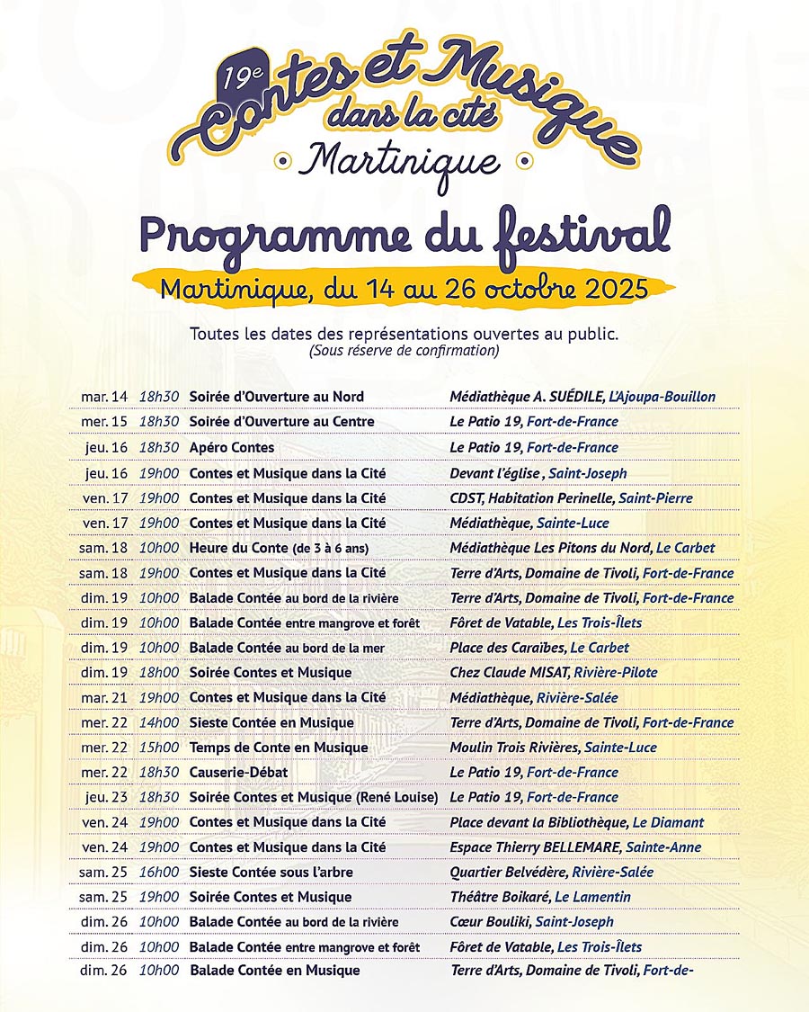 La dix-neuvième édition du Festival International « Contes et Musique dans la Cité » s’annonce vibrante, généreuse et haute en couleurs. Cette année encore, l’Association Martinique Images (AMI), sous la direction artistique du conteur et metteur en scène Valer’EGOUY, vous invite à un véritable voyage dans l’imaginaire, la musique et la tradition orale du monde entier.