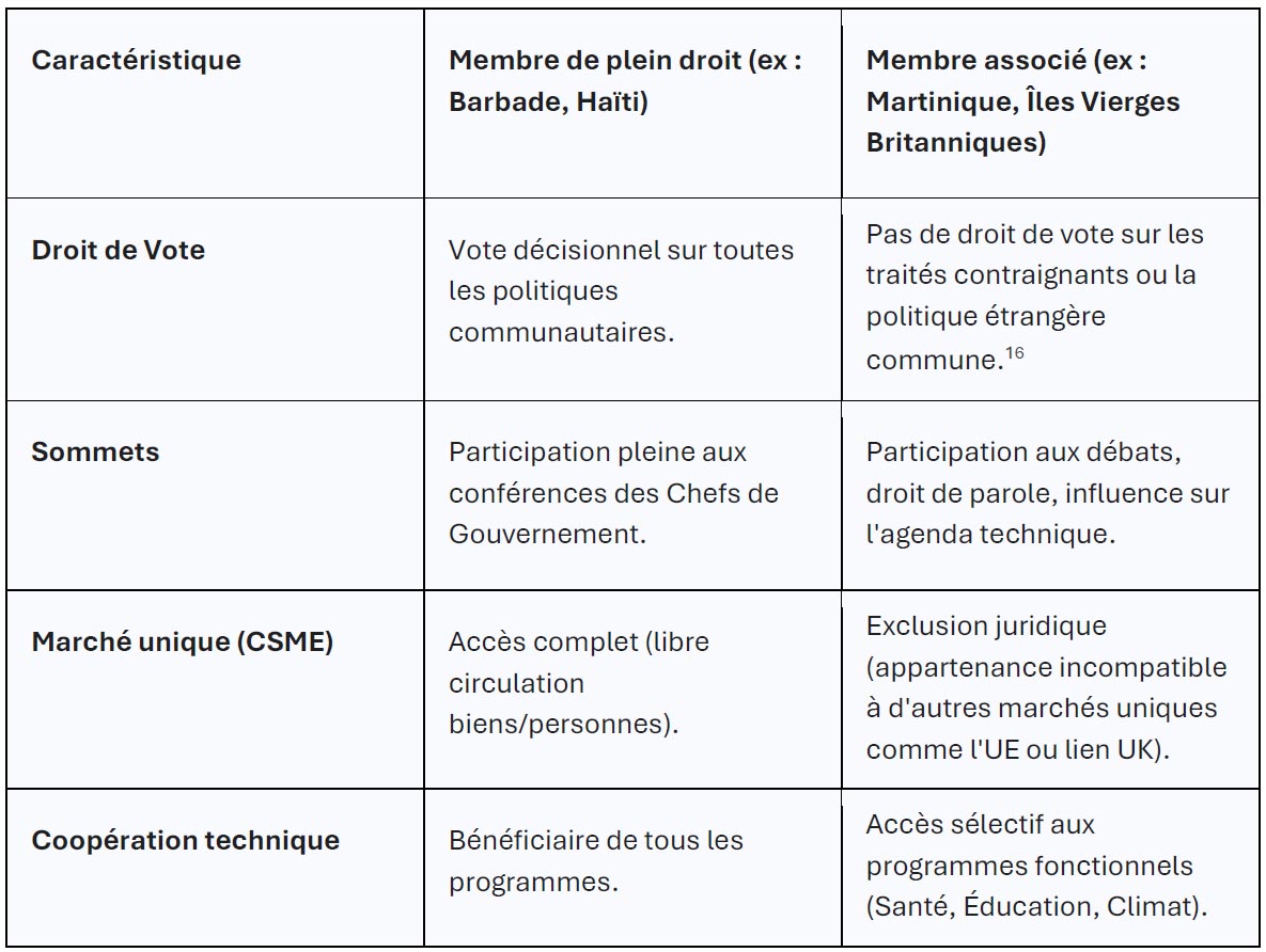 Il est impératif de dissiper tout malentendu sur la nature de cette adhésion. La Martinique ne devient pas un État membre souverain de la CARICOM, au même titre que la Jamaïque ou Trinité-et-Tobago. Elle acquiert le statut de « Membre associé ». Cette distinction juridique entraîne des conséquences importantes quant à la portée réelle de l’intégration.