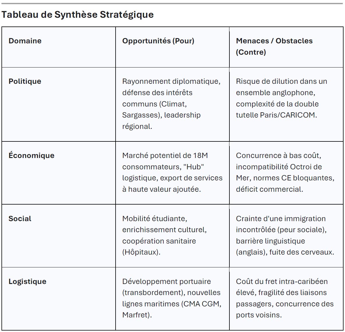 - Le Scénario de la Vitrine : Une adhésion purement protocolaire, où la Martinique siège aux sommets, mais où les échanges économiques stagnent, faute d’adaptation des normes et de la fiscalité.