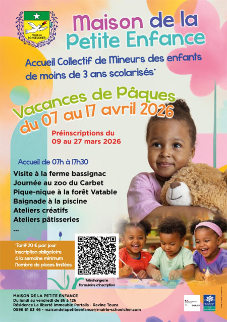 Votre enfant a moins de 3 ans et est déjà scolarisé ? La Maison de la Petite Enfance de Schoelcher propose un Accueil Collectif de Mineurs pendant les vacances de Pâques. – : Préinscriptions : du 09 au 27 mars 2026 |