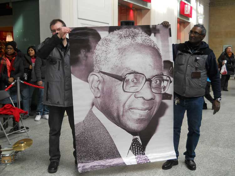 Les cheminots Destais et Neller, portant à bout de bras, le 22 mars à la gare St Lazare, l’image d’Aimé Césaire sous les applaudissements du public.