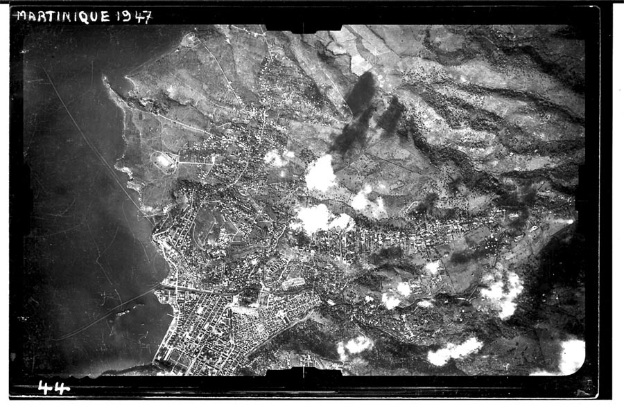 Une qui date de 1947 de l’IGN et qui montre la campagne, au Nord de Fort-de-France, un espace rural vide avec des campêches, bois ti baume, arbres fruitiers, élevages de caprins, bœufs …