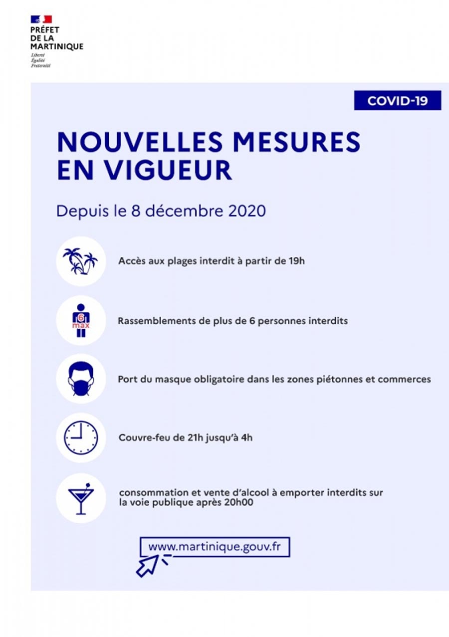 Le ministre des Outre-mer, Sébastien Lecornu, a annoncé jeudi 3 décembre au Sénat que les restrictions de circulation seraient levées à partir du 8 décembre en Martinique, mais qu’un couvre-feu serait instauré de 21h00 à 4h00, avant une possible réouverture des restaurants à partir du 15 décembre.