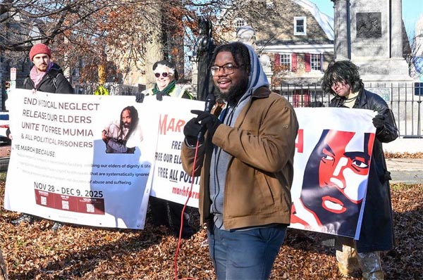 Du 28 novembre au 9 décembre 2025, la “March for Mumia” reliait Philadelphie à la prison de SCI Mahanoy, en Pennsylvanie. Treize jours de marche, 146 kilomètres, une étape quotidienne de 12 à 16 km : la mobilisation entendait rappeler que Mumia Abu-Jamal demeure enfermé depuis quarante-quatre ans malgré les appels internationaux à un nouveau procès.