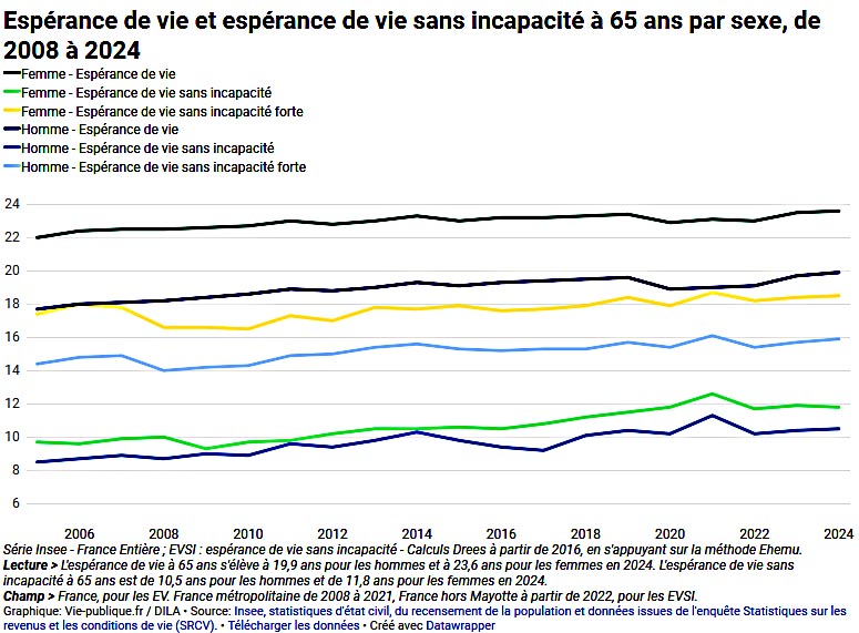 Une étude publiée le 22 janvier 2026 par la Direction de la recherche, des études, de l’évaluation et des statistiques (Drees) révèle que « l’espérance de vie sans incapacité à 65 ans est de 11,8 ans pour les femmes (12 ans en 2023) et de 10,5 ans (sans évolution par rapport à 2023) pour les hommes en 2024« .