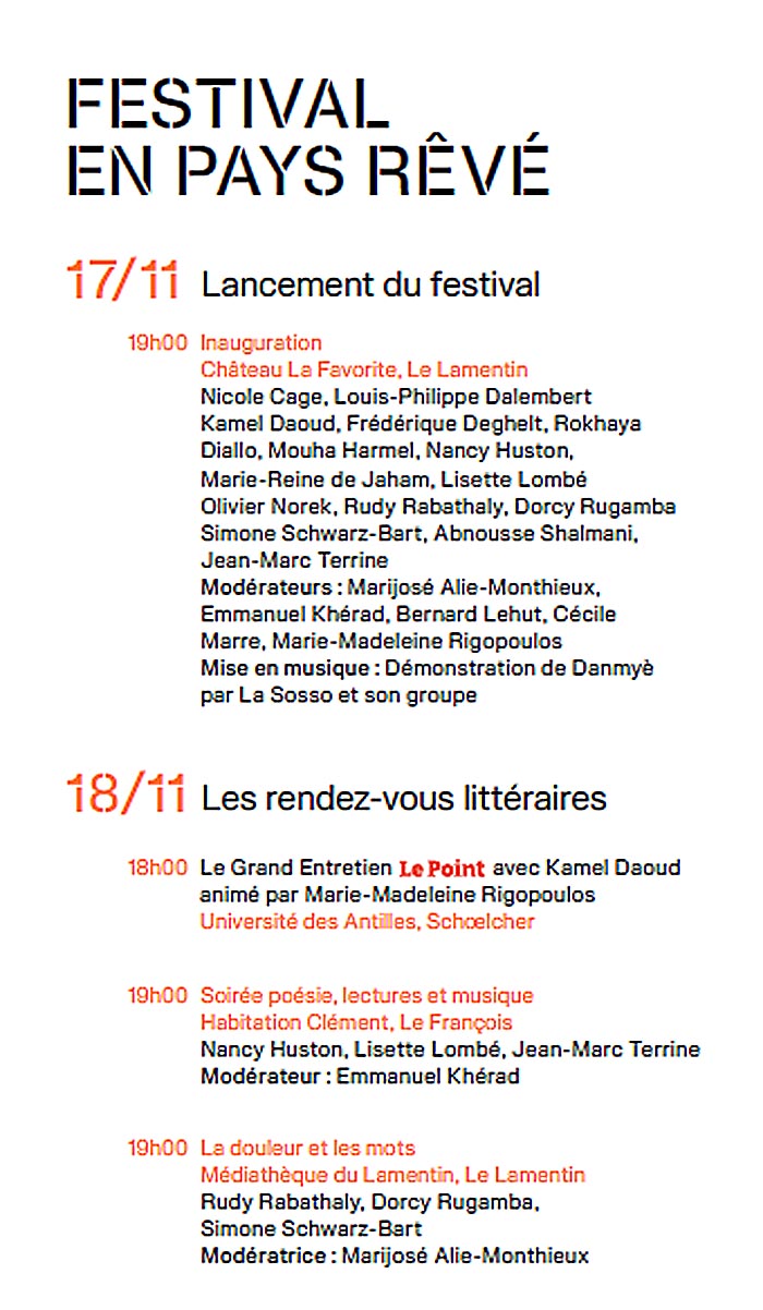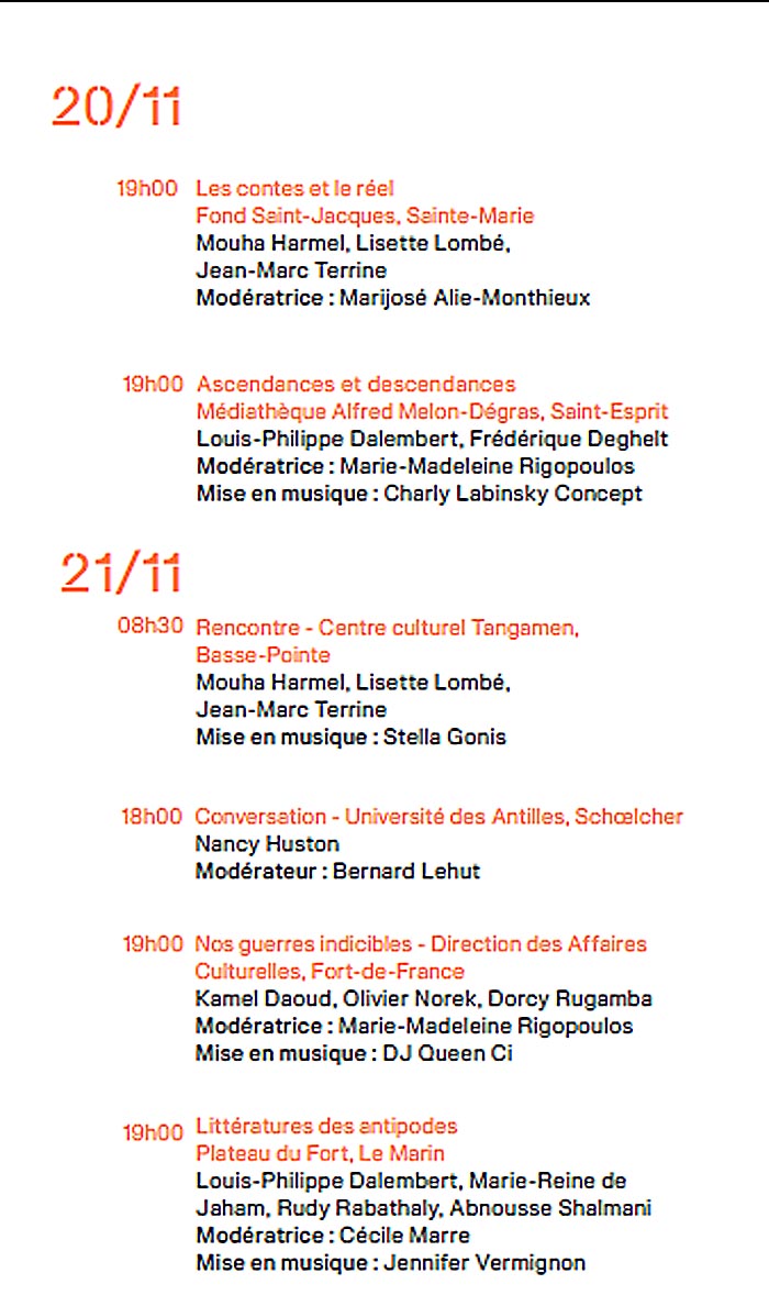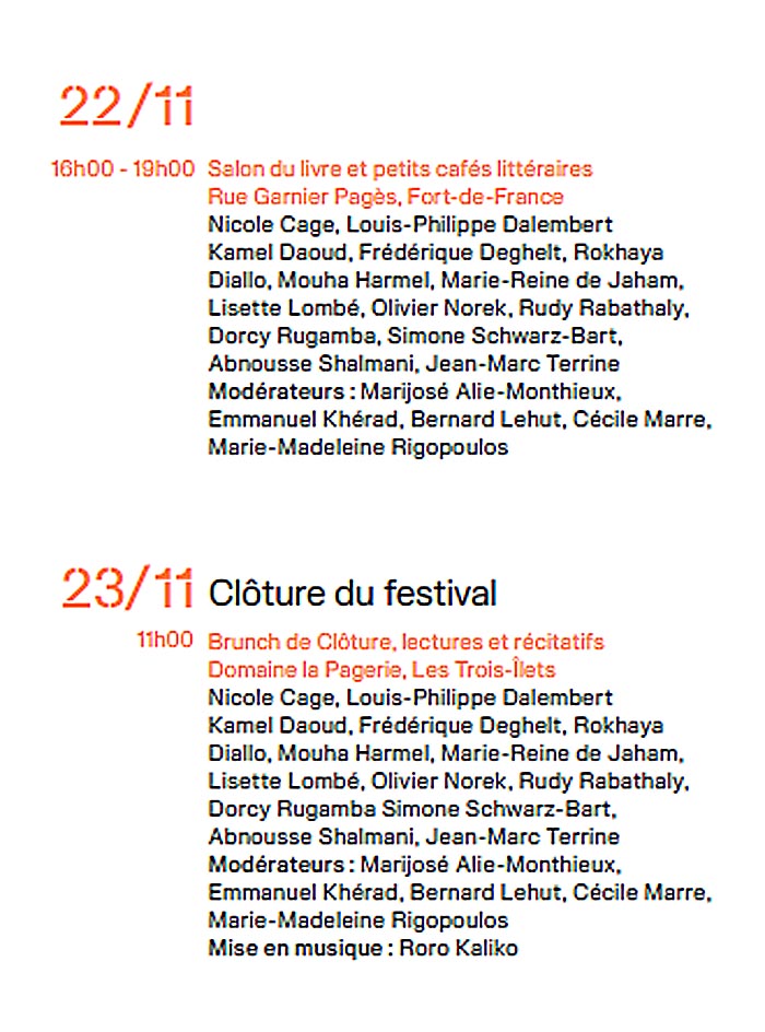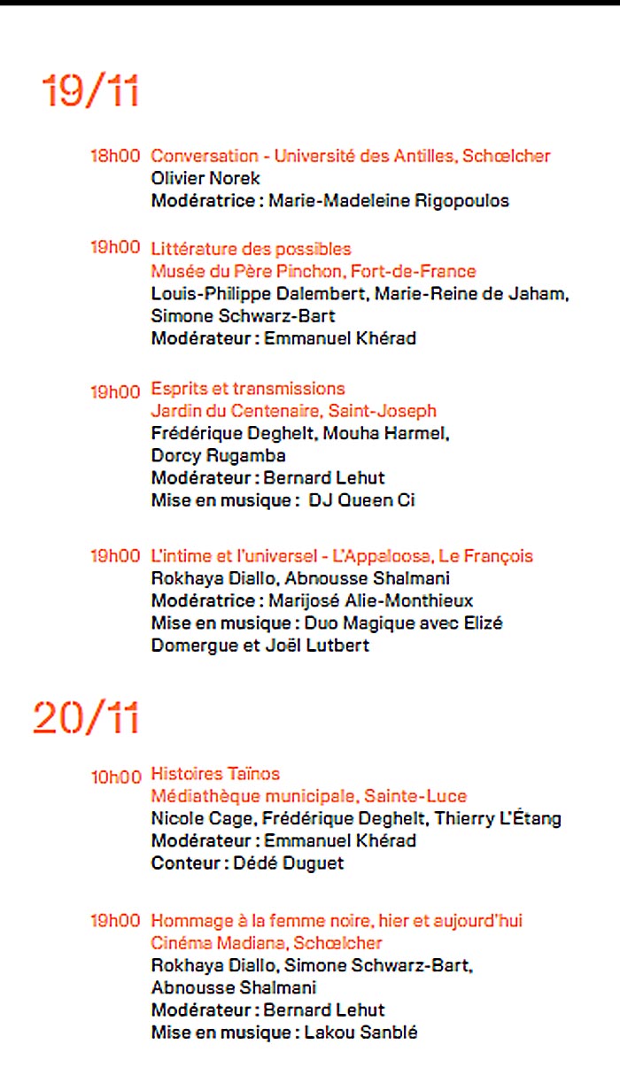 En 2025, année qui célèbre le centenaire de la naissance de Frantz Fanon, pour sa quatrième édition, le festival accueille des autrices et auteurs qui touchent au cœur de cette notion, bien qu’elle soit diffuse et déployée dans des contrées et des univers parfois aux antipodes, avec la lente résilience du génocide ruandais, la guerre blanche de Finlande, l’Algérie de l’indicible, la Martinique des békés, la Rome éternelle transcendée par une plume haïtienne, les territoires du féminisme, le corps noir comme terrain de toutes les blessures, de toutes les conquêtes, la mondialisation à travers l’histoire d’une aventurière, la transition des corps et la prostitution, mais aussi la beauté et la cruauté de nos histoires caribéennes, aujourd’hui et à l’heure des Taïnos, la poésie sociale comme fol espoir de survie et le bèlè comme conscience de nos résistances.