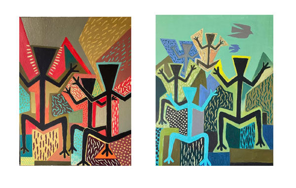 Dans son ouvrage Les Formes du visible, Philippe Descola (Seuil, 2021), au sujet de la simplification dans la représentation de la forme humaine, écrit […] la figuration n’est pas une imitation du réel […], mais plutôt une évocation de ce qui doit être […]. Dans les tableaux d’Éric Vincent, les corps figurés en groupe se présentent debout, de face, sans visage, mais semblent appartenir à la même communauté. Dans leur posture similaire d’orants ou de danseurs, frappant ensemble des pieds la terre, bras et mains telles des antennes ouvertes au ciel, tous participent à un rituel primitif, une sorte d’incantation amérindienne dans la nature. Si les personnages sont figés, la sensation de rythme est palpable. En effet, sur des fonds morcelés géométriques, apparaissent des graphismes stylisés finement peints, évoquant les éléments. Ils animent la surface plane et suggèrent tantôt l’écoulement de l’eau, l’émanation de l’énergie, le crépitement du feu, le rayonnement de la pensée, en bref, le grouillement du monde vivant. Ces graphismes pétillants dans leur rapport coloré en contraste avec les fonds, créent des interférences vibratoires où les corps figurés vivifiés entrent en relation subtile avec la nature qui les entoure.