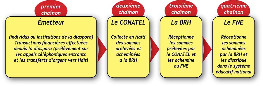 quatrième chaînon : le FNE (réceptionne les sommes acheminées par la BRH et les distribue dans le système éducatif national)