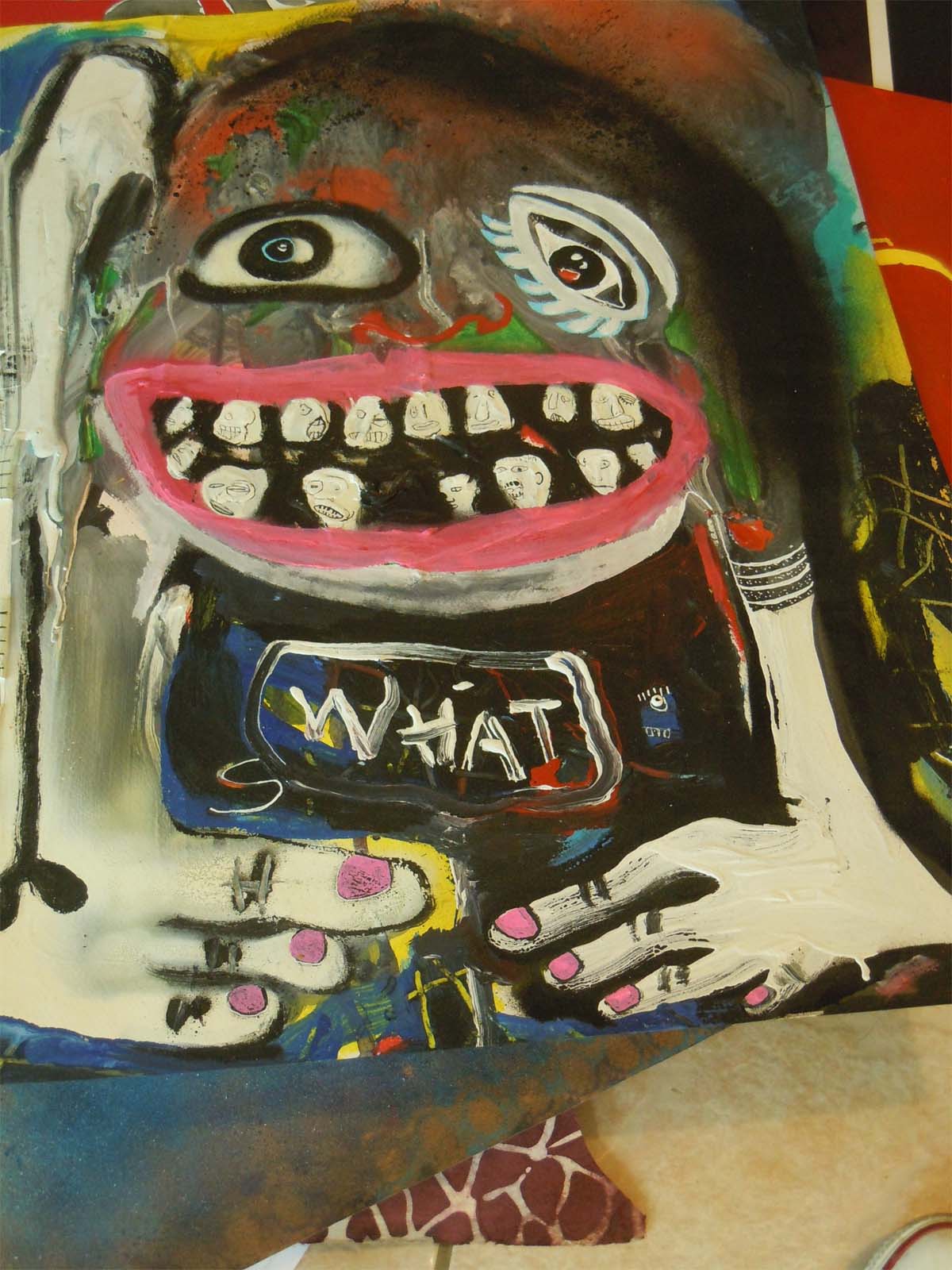Il expose une production d’œuvres d’une grande diversité qui va de 2012 pour l’une, à 2016 et même 2017 pour beaucoup. Des acryliques de très grand format aux couleurs très vives, des collages de papiers Canson découpés, associant les trois couleurs que sont le rouge, le noir et le blanc, des dessins au feutre et crayon de couleur, des œuvres utilisant au besoin le bombage sur papier photo Ilford