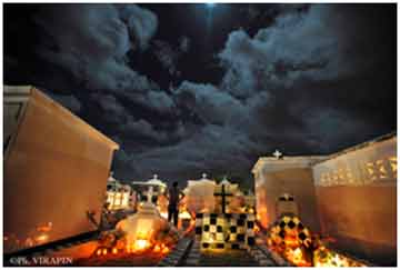 En proie à des « insomnies », Philippe VIRAPIN se livre à des déambulations urbaines, du Moule à Pointe-à-pitre, en passant par Morne-à-l’eau et Jarry. La nuit a toujours été propice à l’inspiration des artistes. « La poésie vit d’insomnie perpétuelle » disait le poète René CHAR, tandis que GOETHE, avec « La nuit de Walpurgis » dans Faust, assimilait la nuit au sabbat des sorcières. Même dans les rues désormais éclairées de nos villes, celle-ci représente, dans l’imaginaire collectif des Antilles, un univers inquiétant où se côtoient des forces maléfiques et des esprits errants qu’il convient de ne pas troubler. Lorsqu’il prétend vouloir dresser un inventaire du patrimoine guadeloupéen, les pas de Philippe VIRAPIN semblent néanmoins aimantés vers des lieux bien particuliers, et comme « habités » par des esprits : bâtiments abandonnés, maison en feu, friche urbaine, cimetière se livrant au culte des morts, église de pierre aux formes menaçantes ou chapelle de la Vierge aux allures de chapelle ardente. Le choix des éclairages et les angles de prise de vue vont donner à des lieux pourtant connus, comme l’église du Moule ou le musée l’Herminier, des allures fantasmagoriques. Le promeneur peut parfois croiser quelques rares humains, tel cet étrange « bwa-bwa » filant on ne sait où, ou encore cette fragile silhouette qui s’encadre dans la porte béante d’une architecture davantage destinée semble-t-il à un géant qu’à un humain. La perception de cet univers urbain dont le travail de Philippe VIRAPIN rend compte est celle d’un monde rendu parfois par des couleurs froides évoquant la mort, ou tantôt la proie de flammes évoquant l’enfer. Dans tous les cas il s’agit d’un univers qui menace l’homme. C’est de préférence durant la pleine lune que s’effectuent les « Voyages au bout de la nuit » du photographe, comme en témoigne une superbe photo, quasiment abstraite, dans laquelle le globe lunaire se détache sur l’obscurité d’une nuit noire. Ou lorsque le tracé sinueux d’un éclair nocturne semble suggérer la manifestation d’une présence occulte. Le traitement le plus saisissant du réel est peut-être obtenu avec une photo en couleur d’un très grand format, située au deuxième étage. La partie supérieure de la photo, qui représente plus de la moitié de celle-ci, est consacrée à un ciel surchargé de nuages qu’éclaire dans une trouée, comme le ferait une ampoule électrique, la lumière de la lune. Dans la partie inférieure, et au milieu d’un fatras de tombes subissant la déformation du grand angle, une femme de dos, mains sur les hanches, fait face à une lumière irradiante qui semble émaner d’une tombe. Quelque chose d’énigmatique, un mystère surgit de la tension existant entre les deux parties de la photo. On comprend alors aisément comment une technique parfaitement maîtrisée peut être au service d’une subjectivité qui s’assume. Et force est de reconnaître que BAUDELAIRE a assurément eu tord de croire que la photographie était condamnée à rendre compte avec exactitude de la réalité.