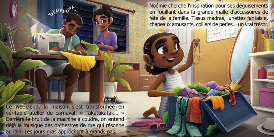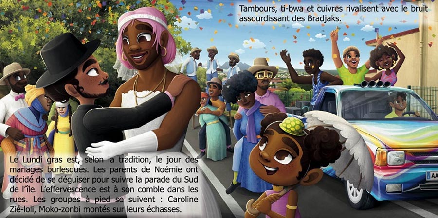 Dans l’histoire, Noémie est accompagnée de ses cousins et participe activement à la confection des costumes et des accessoires. Le récit met en avant les moments familiaux passés à créer ensemble, à préparer la parade et à partager l’excitation de l’événement. L’autrice souligne ainsi que le carnaval n’est pas seulement un spectacle, mais aussi un temps de préparation et de solidarité familiale. L’album présente également des figures emblématiques du carnaval antillais comme Marianne Lapo-fig, les Nèg gwo siwo, les Diables rouges et le roi Vaval, personnage central de la fête. En intégrant ces personnages traditionnels dans son récit, Jade Amory transmet aux enfants des repères culturels précis tout en rendant l’histoire vivante et accessible.