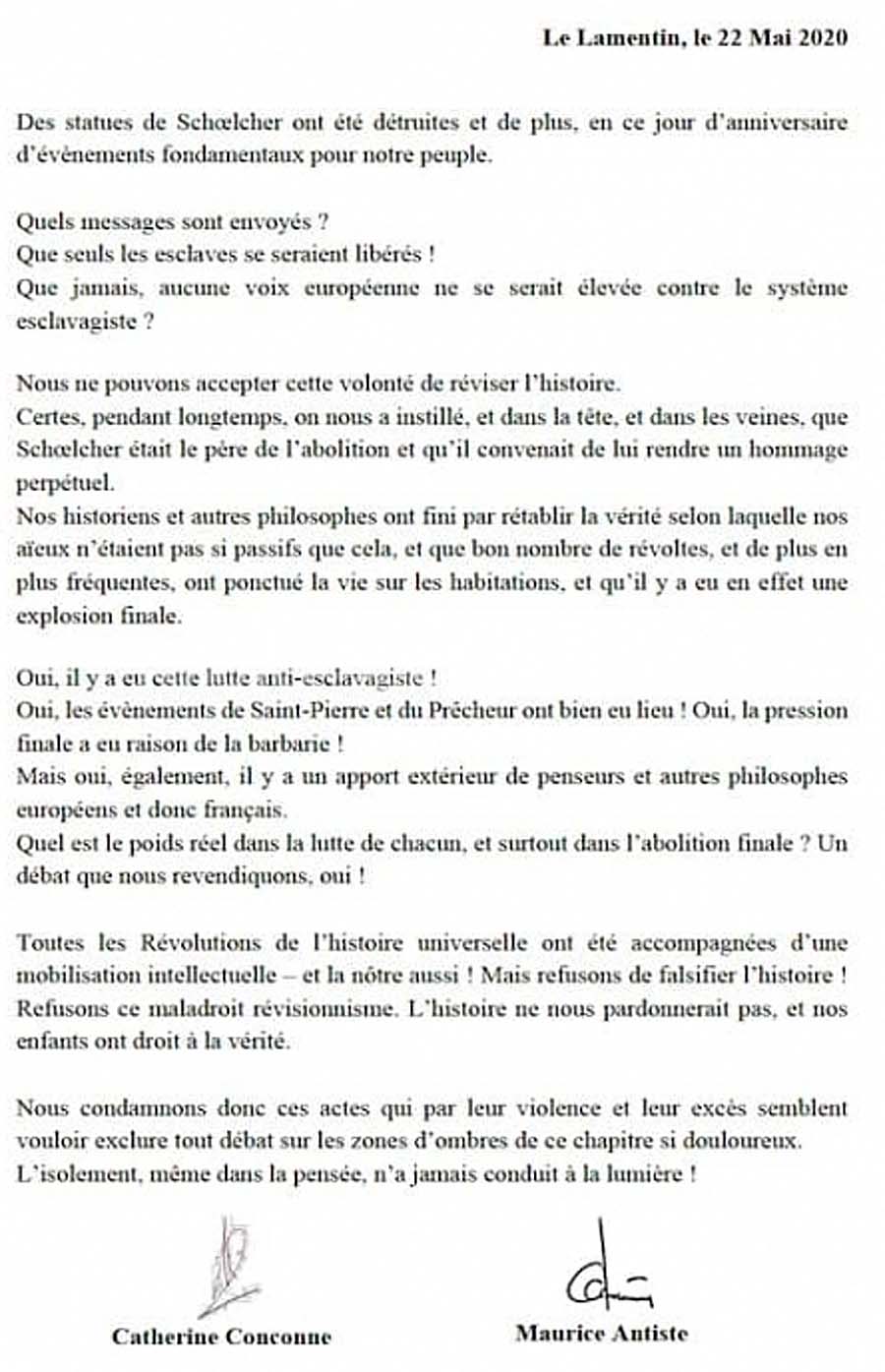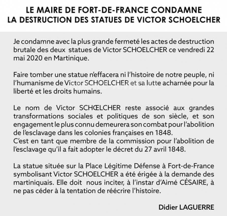Par conséquent, je condamne sans réserve les actes de dégradation et de vandalisme ciblant les statues de Victor Schœlcher, survenus en pleine journée ce 22 mai 2020 à Fort-de-France et à Schœlcher. »
