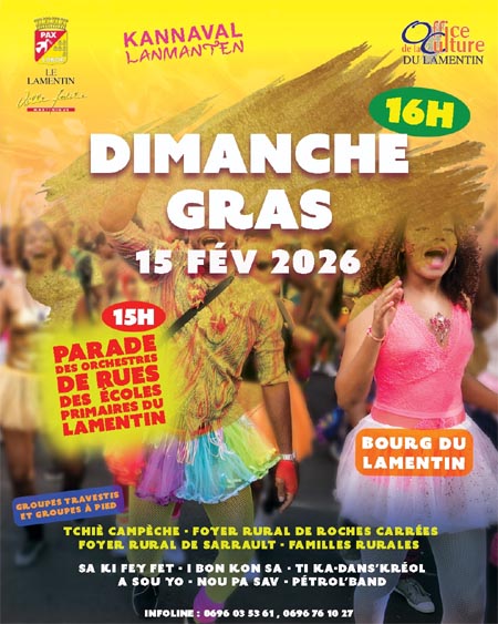 - Lundi gras : Dès l’aube, les groupes à pied, souvent composés de voisins ou d’amis, parcourent les quartiers pour réveiller la population, dans un esprit convivial et festif. L’après-midi, les plus grands défilés se déroulent à Fort-de-France et dans le sud de l’île, marqués par des parodies de mariages burlesques.