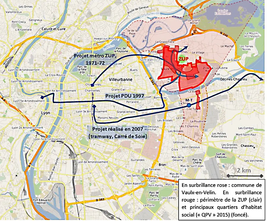 À Vaulx-en-Velin, les projets de desserte des grands ensembles incarnent bien les effets de ces nouvelles grilles de lecture. Ces projets sont progressivement abandonnés ou redéfinis, tandis que les investissements se concentrent sur d’autres secteurs jugés plus stratégiques et attractifs. Résultat : lorsque le métro et le tramway arrivent finalement à Vaulx-en-Velin, à la fin des années 2000, ils contournent les quartiers d’habitat social les plus peuplés pour desservir un nouveau quartier aux fonctions économiques métropolitaines et avec des logements moins accessibles.