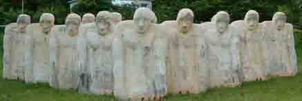 Face au rocher-vaisseau du Diamant, stigmate dressé d’une ancienne puissance coloniale, quinze blanches silhouettes hurlent silencieusement leur appétit de respirer libres. Tournées vers la mer qui les a amenées, prisonnières, sur ces rivages, bien plantées dans la terre martiniquaise devenue la leur, elles clament la souffrance. La masse imposante de chacune d’elles, à l’image d’un totem, force l’espoir dans la revendication muette, exigence d’esclave qui ne tolère plus de ramper sous le joug. La tête inclinée vers le sol, le corps fiché dans le socle du malheur, chacune a laissé pendre ses bras jusqu’à ramasser la dignité en allée. Chacune s’apprête à rebondir hors du champ imposé par la volonté de l’Autre, parce qu’il n’est pas tolérable de demeurer attaché au sillon comme une bête de somme.