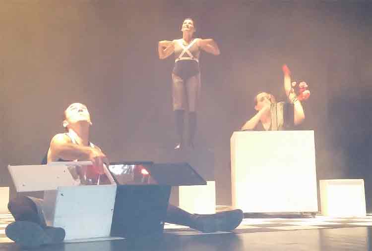 De ce titre énigmatique, proposé par Ricardo Miranda pour sa nouvelle création, nous n’aurons l’explication qu’assez tardivement , dans un des rares passages parlés de ce théâtre dansé — ou de cette danse théâtralisée ? Recherche, pour dire la femme dans un univers d’hommes, d’une forme singulière qui, si elle ne semble pas toujours très bien aboutie, a le mérite d’être servie avec enthousiasme et sincérité par trois complices, soit deux femmes, Lindy et Émilie, et un homme, Ricardo lui-même.