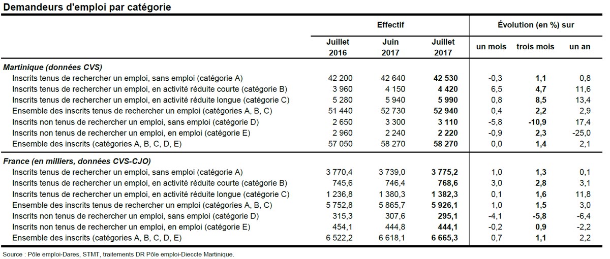 Fin juillet 2017, en Martinique, le nombre de demandeurs d’emploi tenus de rechercher un emploi et sans activité (catégorie A) s’établità 42 530. Ce nombre augmente de 1,1 % sur trois mois (soit +470 personnes). Il diminue de 0,3 % sur un mois et progresse de 0,8 sur un an. Avec une population active de 155 600 ( ) cela fait un taux : 27.34 % à comparer avec la France métropolitaine ( population active : 28.7 millions/ chômeurs de catégorie A : 5,9 millions): 13.24%. Un taux deux fois moindre!